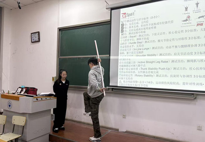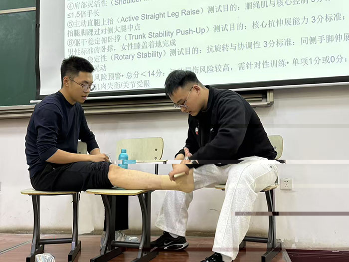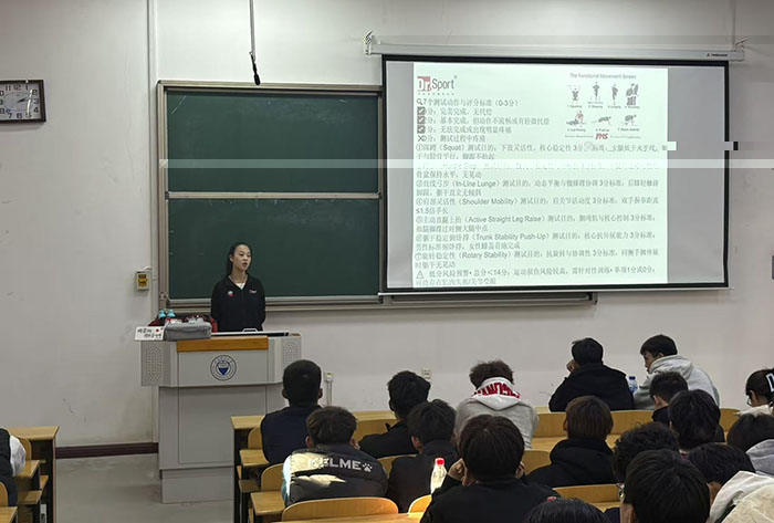 理論授課環節,任凱玲治療師以“運動損傷防治與康複”為核心主題,系統講解了運動損傷的發生機制、科學預防策略、現場緊急處理流程及後續康複訓練方法。她特别指出,運動損傷的預防需貫穿科學訓練規劃、合理恢複安排、功能性篩查等多個維度,且損傷的防治與康複過程本身就是勞動技能的實踐過程,要求學生以嚴謹細緻的勞動态度對待每一個操作細節。此外,她還針對傷後康複鍛煉的階段性安排、支持帶的正确使用技巧、局部與全身協同治療方法等内容展開詳細闡述,知識體系完整、邏輯清晰。
