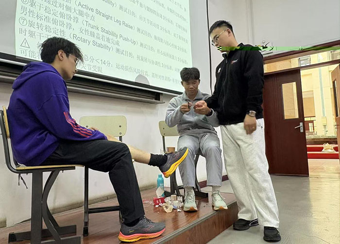 理論講解結束後,靳文卓治療師帶領學生進入實踐互動環節,将勞動技能培訓落到實處。他先是規範演示了功能性動作篩查(FMS)中的7個核心測試動作,動作标準、講解通俗,讓學生快速理解動作要領;随後聚焦實用急救技能,現場教學崴腳後的應急繃帶包紮方法及運動前關鍵部位(腳踝、手腕等)的防護包紮技巧,并細緻演示肌内效貼的裁剪與粘貼方法。學生積極參與實操練習,主動配合演示的同學還獲得了定制小禮品,現場互動氛圍熱烈,将活動推向高潮。