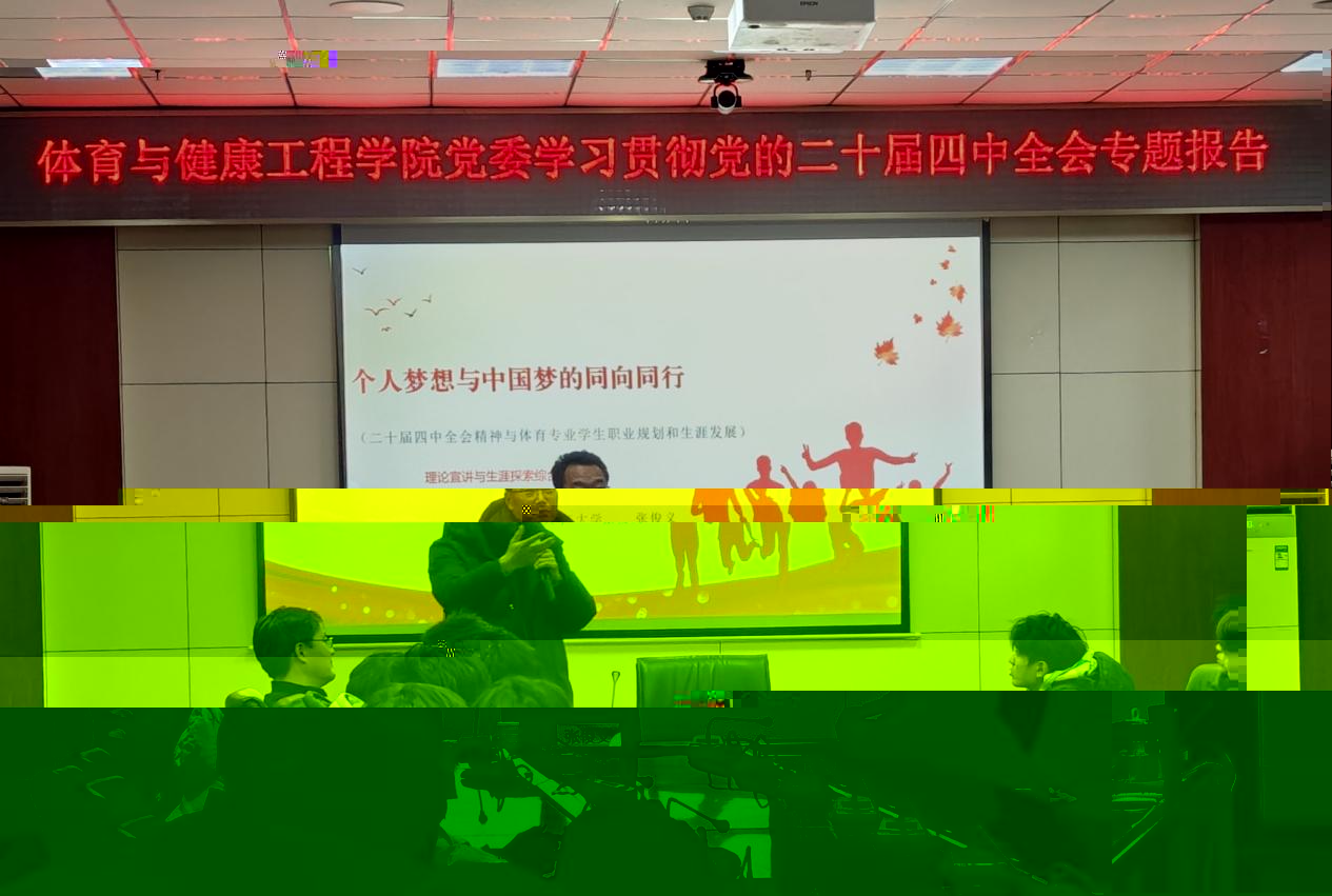 主題報告環節,張俊義老師系統解讀了黨的二十屆四中全會精神。他将宏大的國家戰略與具體的體育教育事業發展緊密結合,闡述了新時代體育工作的新方位。張俊義老師指出,體育強國建設已成為國家戰略的重要組成部分。他詳細分析了當前體育事業發展的政策導向和趨勢變化,強調體育專業學生應當深刻理解這些宏觀背景。“當代體育青年肩負着特殊的時代使命。”張俊義在報告中強調,個人理想必須與國家需求緊密結合,這是新時代體育人的責任與擔當。